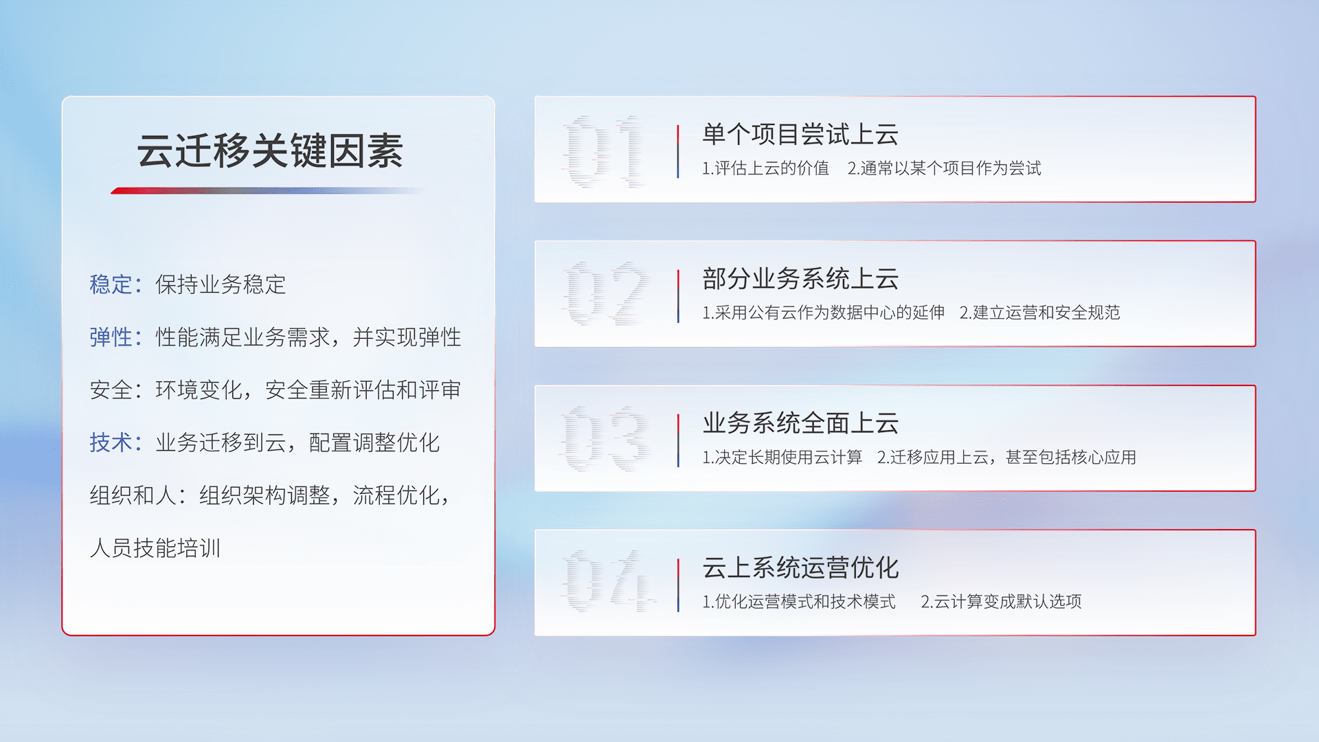 结合实际业务,,,,从规划设计、、、、云平台选型、、云原生改造、、、数据迁移、、、集成交付,,,,迁移全过程为客户识别最佳上云路径,,,做好风险识别管理,,,设计网络架构、、身份权限、、、安全审计合规、、、、操作审计、、、日志审计、、、监控告警策略、、多站点容灾设计等,,,,对云上基础设施进行整体规划,,,提升IT治理水平,,,以满足弹性、、、、高可用、、、、高性能的需求。。。