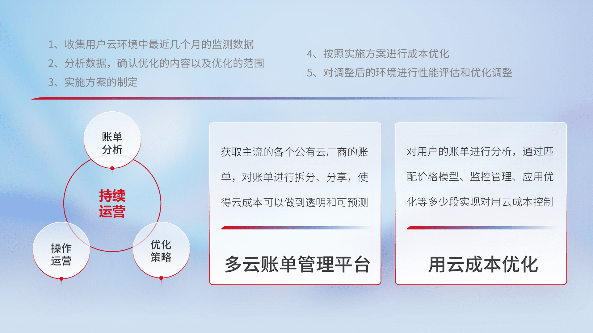 通过多云纳管,,以统一的资源数据模型把客户的云资源进行抽象和封装,,,进而实现对多云资源的统一操作,,保障云资源管理的可靠性、、、稳定性与可用性。。量身定制化运维内容,,配置、、开发运维、、补丁管理、、、备份、、监控、、认证和访问管理、、审计和日常巡检等,,,保障在用云过程中的可靠度,,,稳定度以及高可用率。。