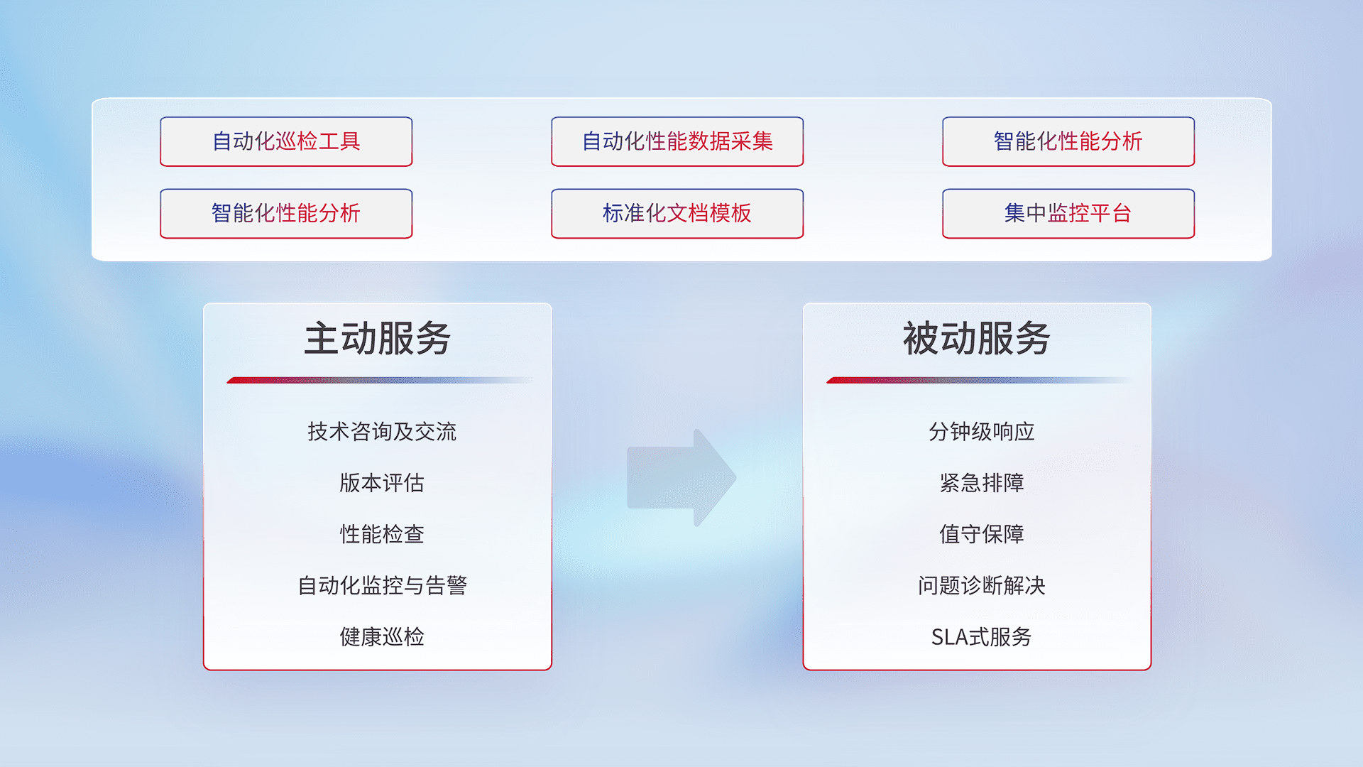 智能化工具和标准化文档,,,保障服务质量,,提供主动服务(包含技术咨询、、、、版本评估、、、性能检查、、自动化监控与告警、、、健康巡检)和被动服务包含(分钟级响应、、、、紧急排障、、、值守保障、、、、问题诊断解决、、、SLA服务)。。